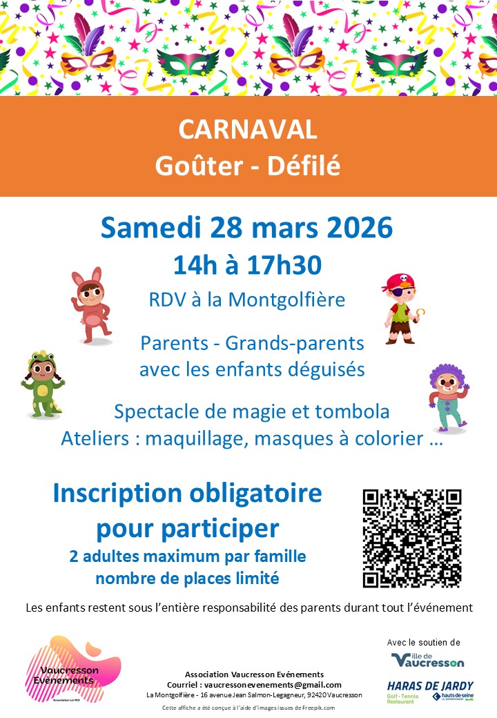 Avec le soutien logistique de la Ville, Vaucresson Evènements accueillera les enfants accompagnés de leurs parents au Centre culturel La Montgolfière autour d’un goûter animé (magicien, maquillage, tombola et autres surprises …), suivi d’un défilé en centre-ville.