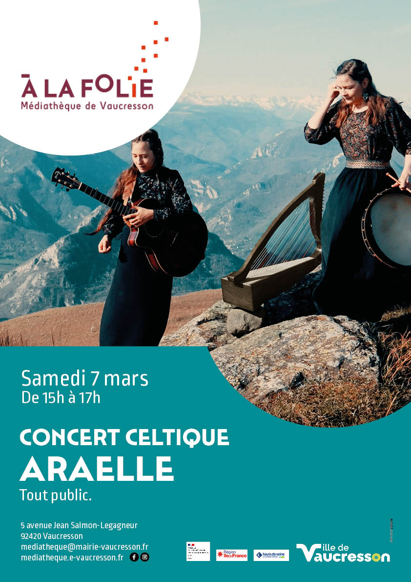 - Samedi 7 : Concert celtique Araëlle. Auditorium de la médiathèque À la folie, 15h-17h. Public familial. Tout public. Entrée libre dans la limite des places disponibles