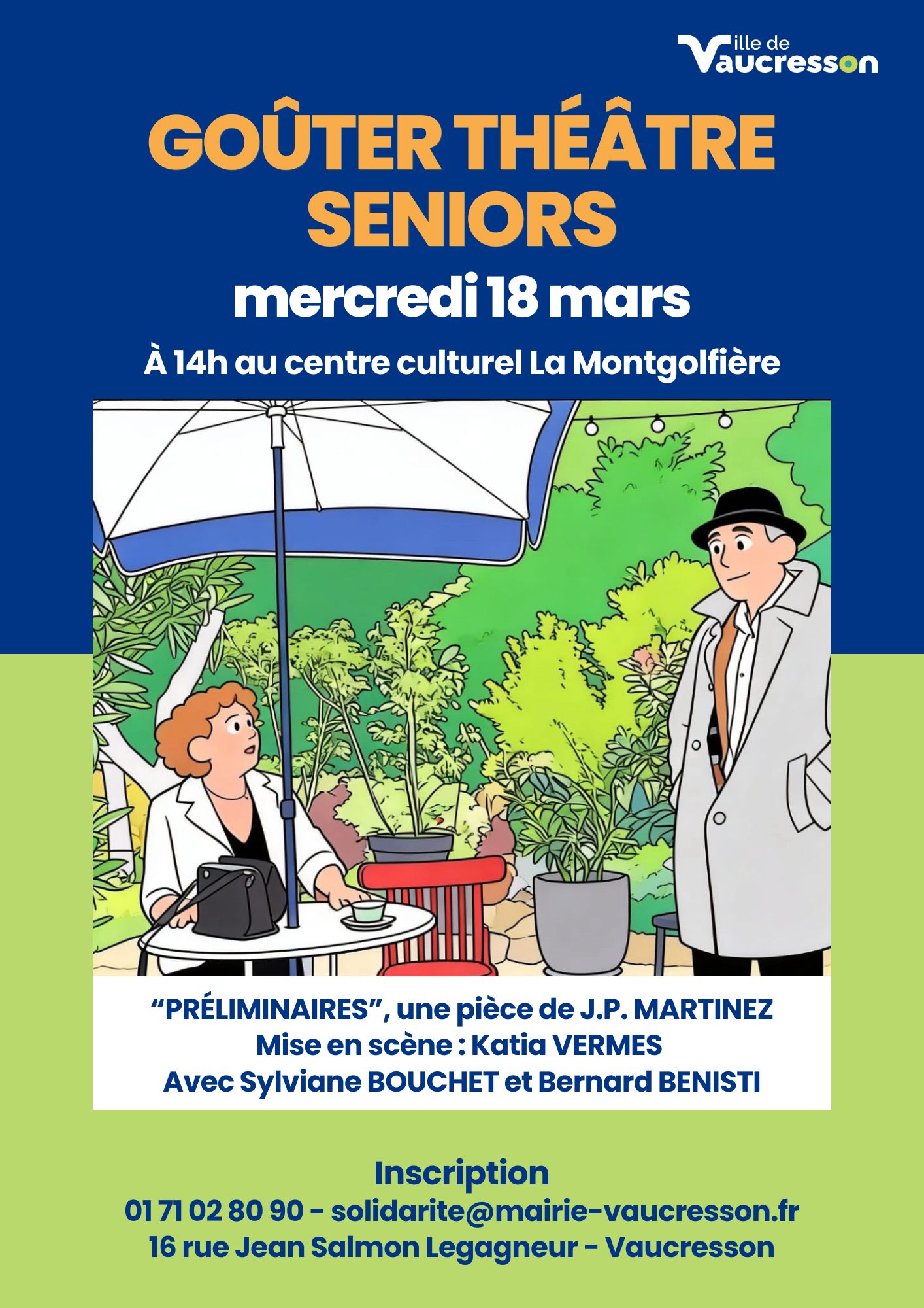 - Mercredi 18 : Goûter-théâtre seniors au centre culturel La Montgolfière 14h. Réservations : 01 71 02 80 90 ou par mail : solidarite@mairie-vaucresson.fr